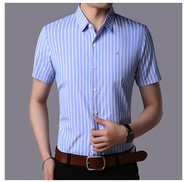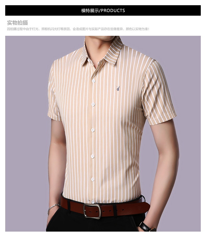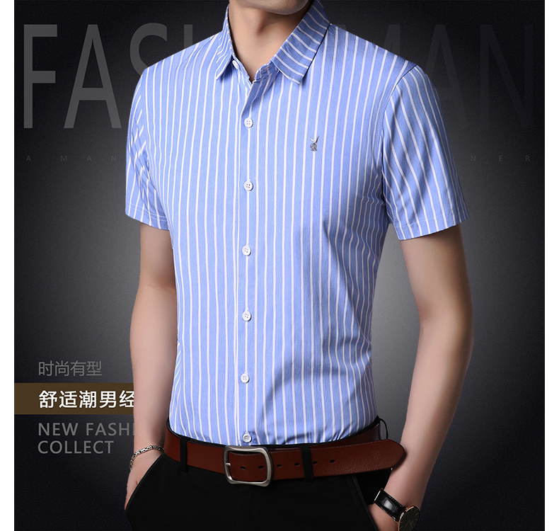 花花公子男士短袖衬衫条纹修身商务休闲青年免烫短袖衬衣男寸衫潮