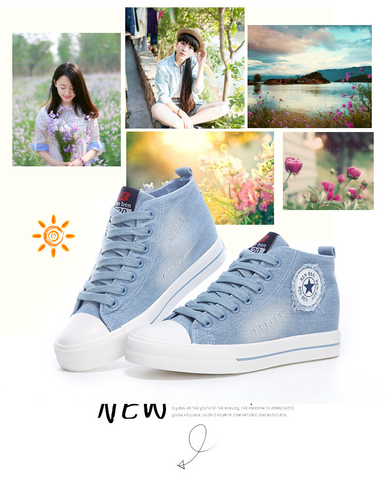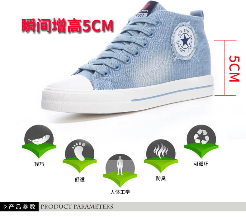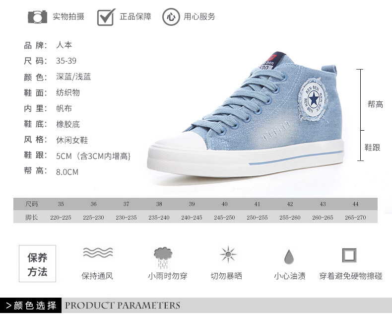 产品名称:人本高帮帆布鞋内增高布鞋高邦高腰单鞋牛仔布系带学院风学生款女